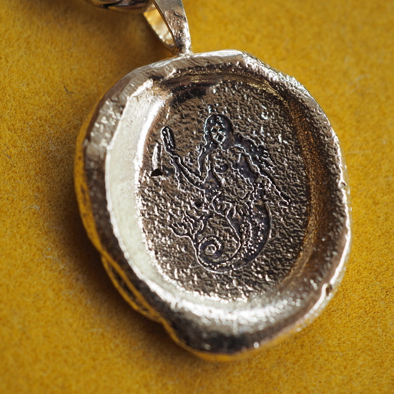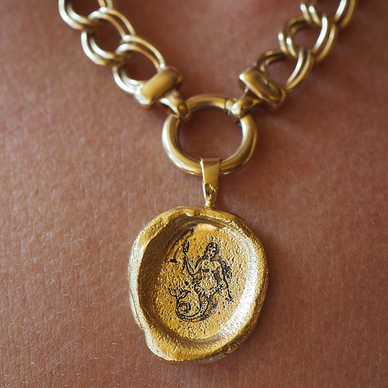 T H E MARGATE C O L L E C T I O N is inspired by the British coastline and the delicate balance ever present within the natural world. This necklace is cast from a wax seal and then engraved with a mermaid. The gold plated hangs on a double link 18” chunky curb chain with clip fastener and the silver hangs on an 18” heavy Belcher chain.
