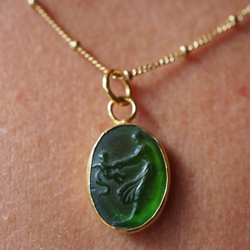 T H E MARGATE C O L L E C T I O N is inspired by the British coastline and the delicate balance ever present within the natural world. This necklace is made of Margate found green sea glass that has been intaglio imprinted with a mother and child illustration and hangs on an 18” fine beaded curb chain. This necklace represents motherhood, life, birth, love and the devine feminine. Green sea glass symbolises renewal, growth and healing, reflecting its connection to nature and the earth. It is associated with the Heart Chakra, promoting love and compassion, and represents the journey of transformation and resilience. Additionally, it embodies the beauty of finding brokenness in nature, transforming discarded objects into cherished treasures.