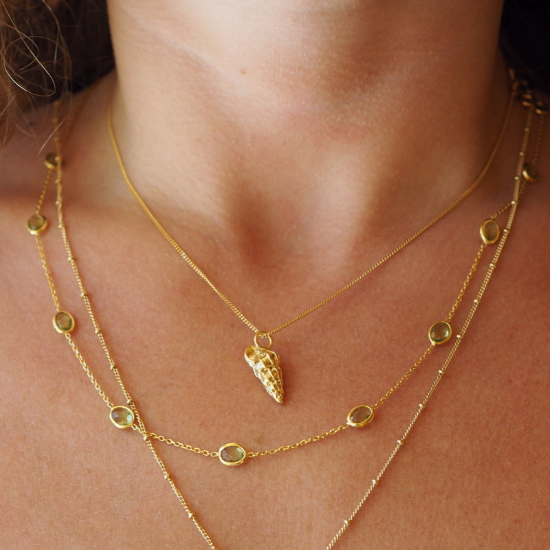 T H E MARGATE C O L L E C T I O N is inspired by the British coastline and the delicate balance ever present within the natural world. This necklace is made of oval peridots to depict the bladder wrack seaweed found along the walls at walpole bay sea bath and hangs on an adjustable 18”- 20”fine curb chain. Peridot is a gemstone known for its vibrant green colour, symbolising renewal and growth. It is often associated with emotional healing, prosperity, and protection. This stone holds a rich history across different cultures and traditions, providing both mythical and cultural significance.