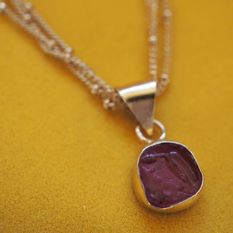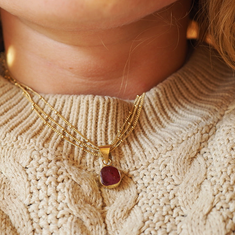 T H E DOLCE C O L L E C T I O N is inspired by a trip Reo made travelling from Venice all the way through Italy down to Naples. This necklace is made from a piece of blood red Venetian glass set in sterling silver and plated with 18ct gold and hangs on an 18” triple beaded chain. This piece is inspired by a trip Reo made to Venice where she acquired this antique piece of glass and has paired it with the beaded chain as a nod towards a rosary.