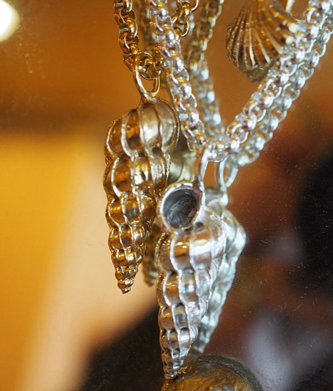 T H E MARGATE C O L L E C T I O N is inspired by the British coastline and the delicate balance ever present within the natural world. This necklace is cast from a Wentletrap shell found on the shoreline at walpole bay in Margate Kent and hangs on a 22” heavy Belcher chain. The shell is universally recognised as a positive feminine symbol which represents birth, life, resurrection, love and good luck.