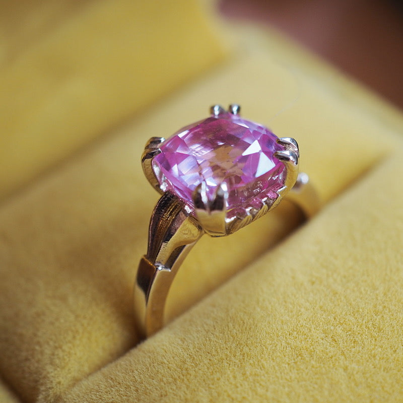 T H E ONE-OF-A-KIND C O L L E C T I O N is inspired by Reo's world travels, from India to South America and the vast collection of precious stones she has collected along the way. Fusing modern trends with traditional methods Reo has created some exquisite one-off beauties that are featured and available to buy here. This one-of-a-kind Cushion cut pink Morganite stone is set with Art Deco claws made in solid 9ct gold. Each piece is hand made in my Margate studio and is as unique and individual as the craftsperson that made it and the customer who buys it.